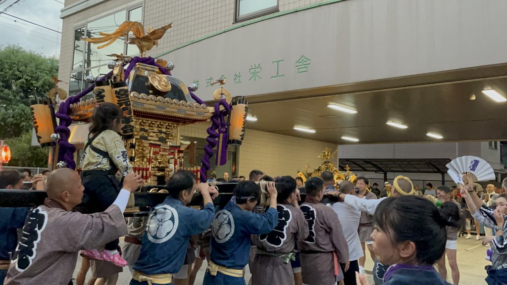それぞれの町会を巡行していた2つの神輿が栄工舎の前で向かい合い、威勢の良い掛け声が響き渡る瞬間は圧巻で、地域全体が一体となる瞬間でした。